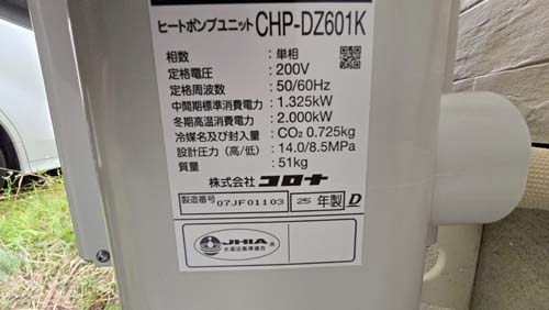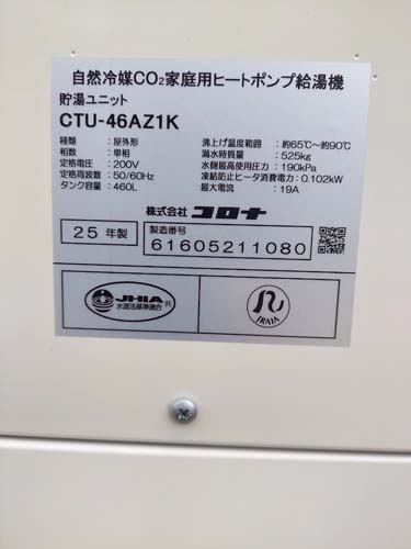 鹿島市高津原 コロナ自然冷媒CO2家庭用ヒートポンプ給湯機 ヒートポンプユニットCHP-DZ601K、貯湯ユニットCTU-46AZ1K エコキュート交換工事