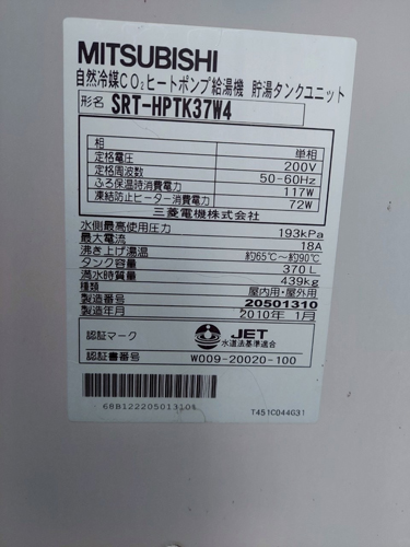 唐津市南城内 三菱電機自然冷媒CO2ヒートポンプ給湯機 貯湯タンクユニットSRT-HPTK37W4→コロナ自然冷媒CO2家庭用ヒートポンプ給湯機 ヒートポンプユニットCHP-DZ451K エコキュート交換工事