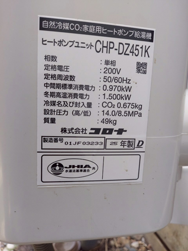 唐津市南城内 コロナ自然冷媒CO2家庭用ヒートポンプ給湯機 ヒートポンプユニットCHP-DZ451K エコキュート交換工事