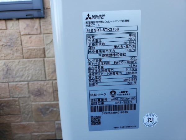 嬉野市家庭用自然冷媒CO2家庭用ヒートポンプ給湯機貯湯ユニットSRT-STK375D エコキュート交換工事